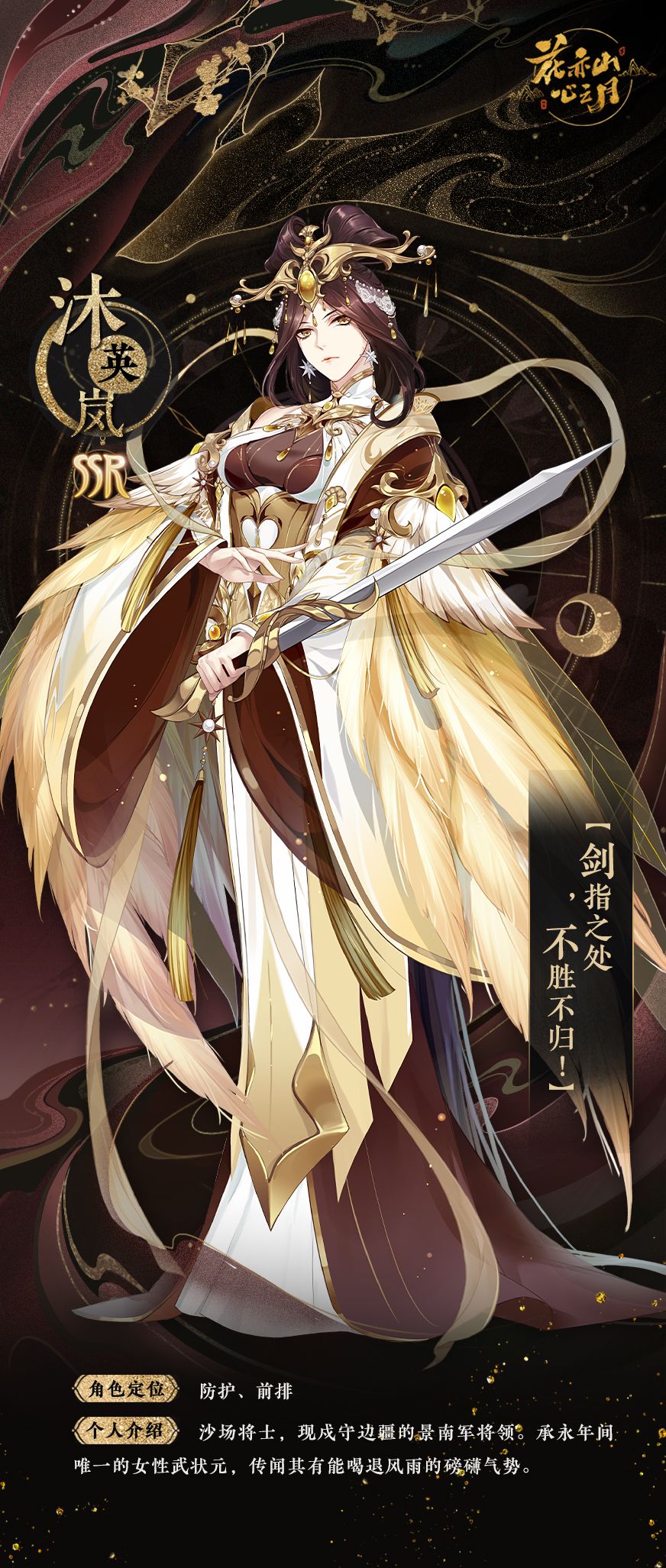 沙场将士,现戍守边疆的景南军将领。承永年间唯一的女性武状元,传闻其有能喝退风雨的磅礴气势。