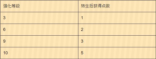 以下表格为强化等级与转生后获得点数的关系(最高为10等)
