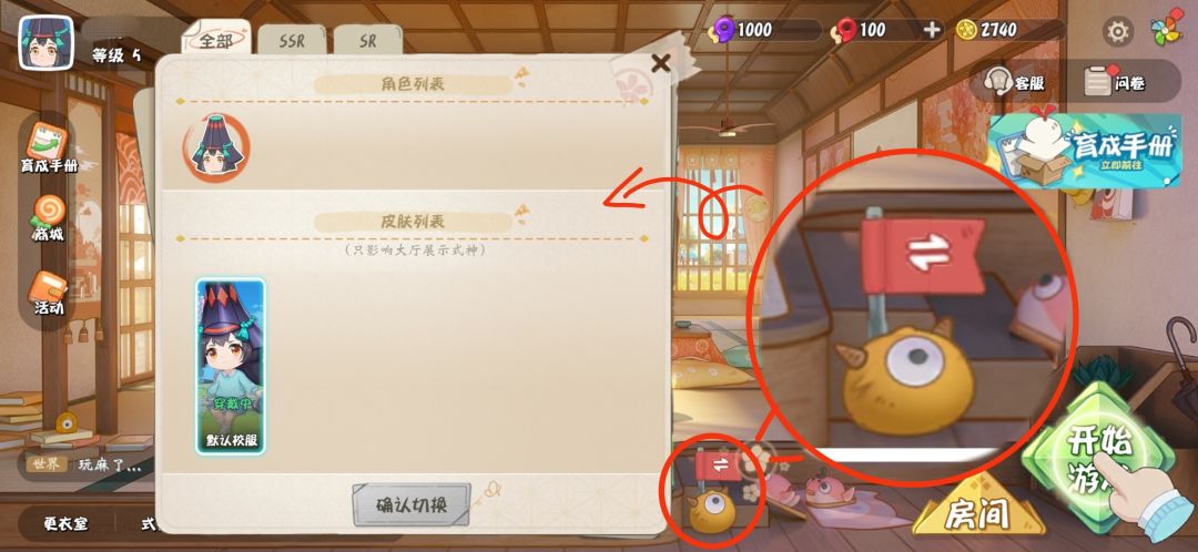 如果想要更换宿舍内的式神,可以点击楼梯旁边的小球球就可以更换式神了。