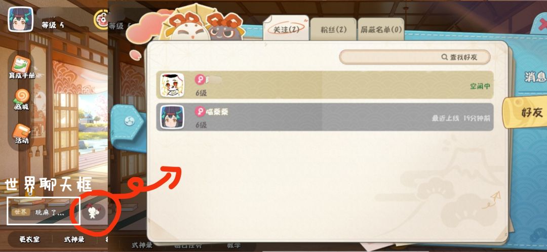 在世界聊天框的旁边有一个小纸人,小纸人代表了你的好友列表。互相关注之后就可以成为好友了。
