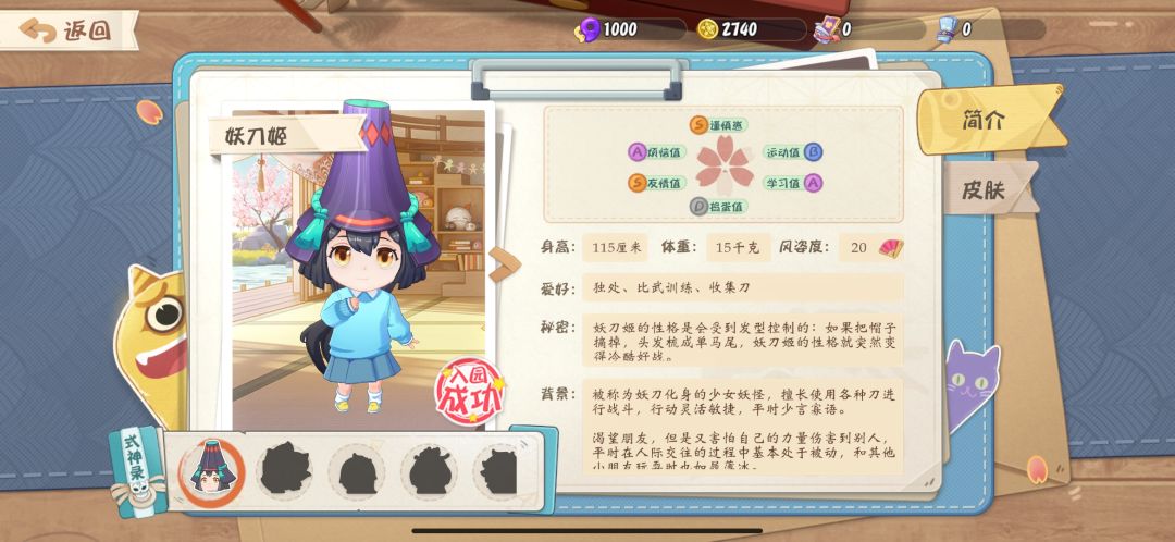 式神录就是介绍你选择式神的身高体重,年龄增加的分支度,爱好秘密以及背景。也可以在这个界面切换皮肤。