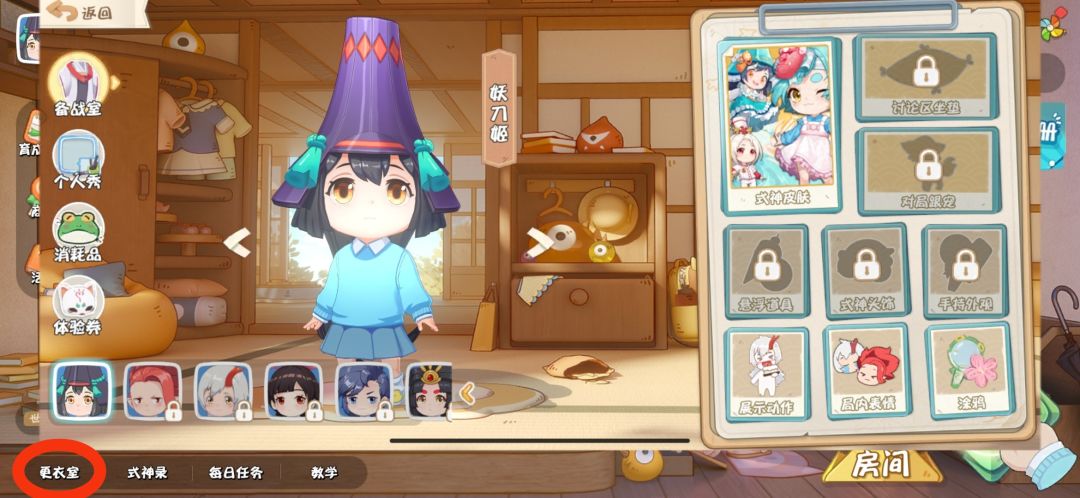 在世界聊天框的下面有一个更衣室,更衣室里面可以更换式神的皮肤还有个人秀,消耗品,体验券以及展示动作,局内表情和涂鸦。