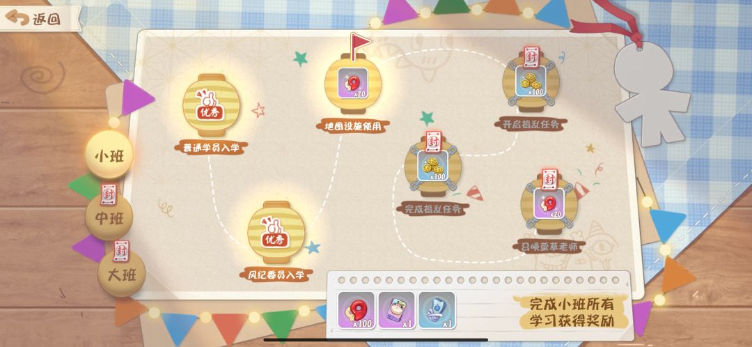 教学里面分为小中大三班。(目前只开启了小班哦!)过完所有的教程之后就可以获得奖励了。