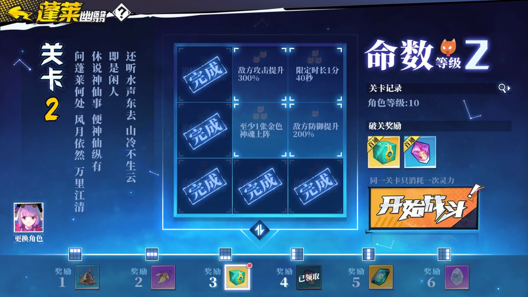 玩家可以通过多次入阵解决所有的命数,当所有的命数都被选择过后,完成破阵,进入下一轮回;