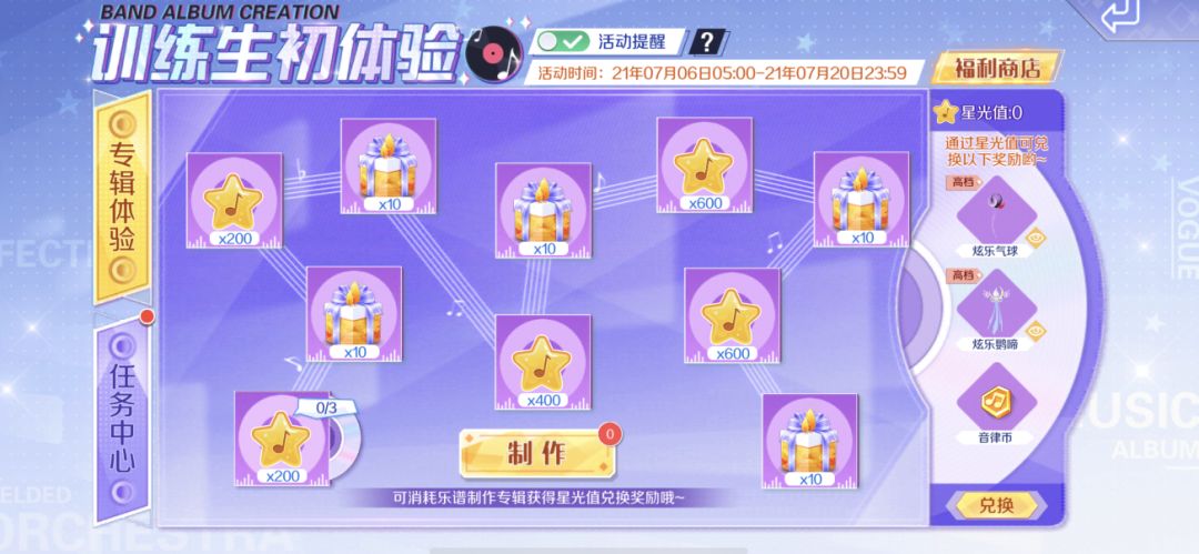 截止至7月20日,完成任务消耗乐谱可制作专辑,获得星光值兑换奖励,限定背饰&手持&音律币的奖励通通可兑换哦~