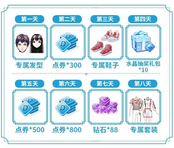 7月11日-7月31日期间,连续登录游戏即可领取钻石*88、点券*1600、水晶抽奖礼包*10、勇者远征组合装四重登录好礼~