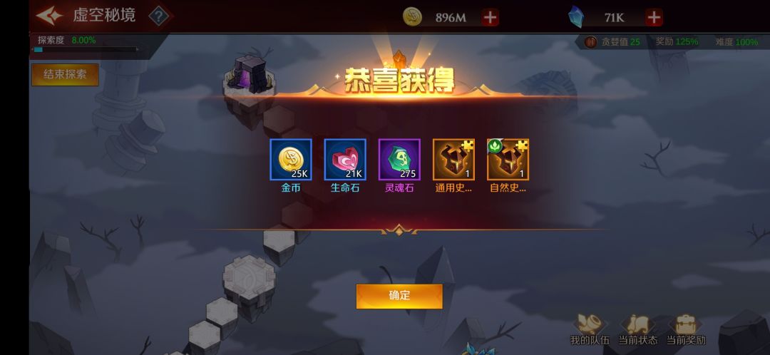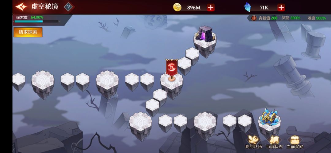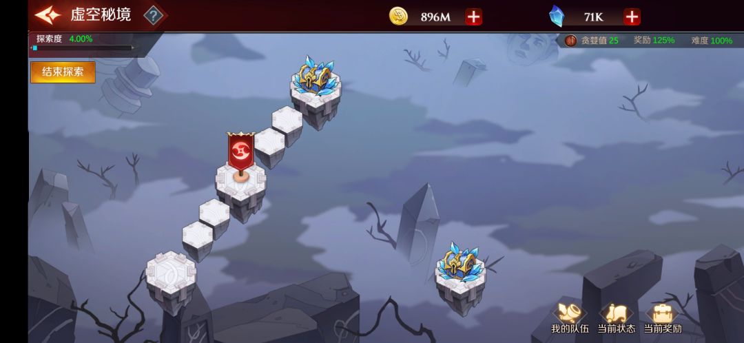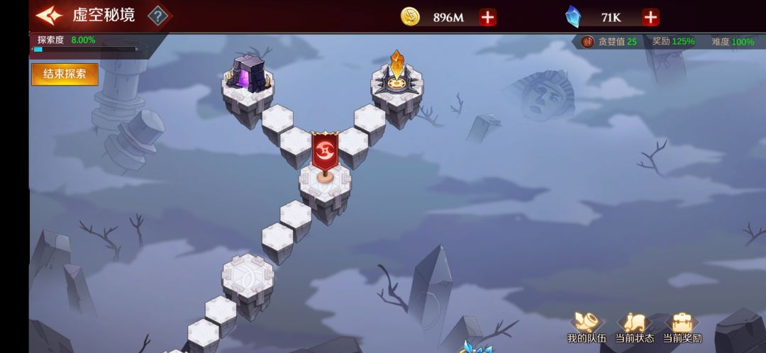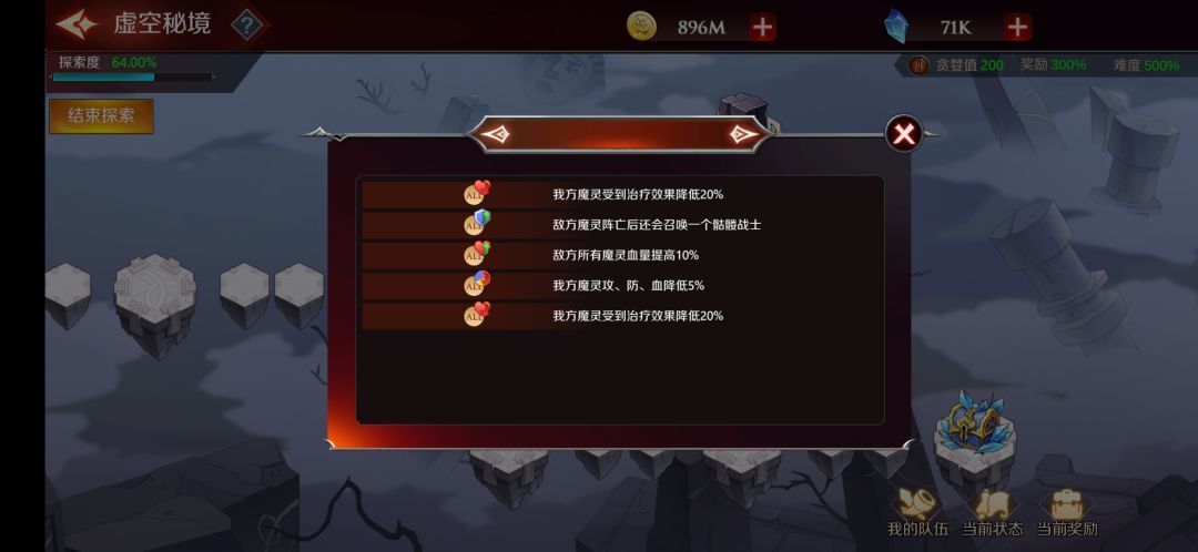 界面的右下角有我的队伍(就是编队)、当前状态(探索过程获取的buff和debuff)、当前奖励(中途退出可以获得一半奖励)。