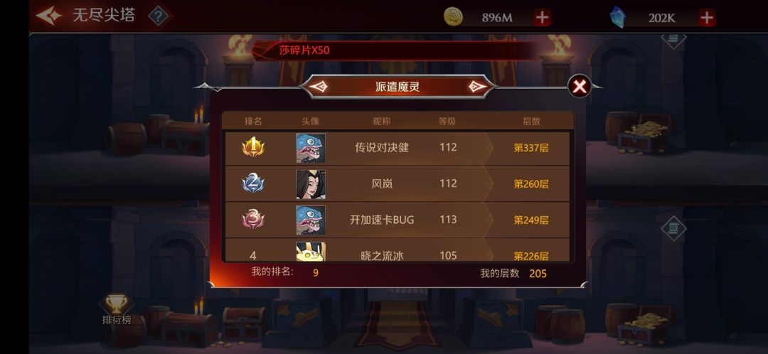 无尽尖塔左下角会有一个排行榜,记录全服玩家的层数排名。