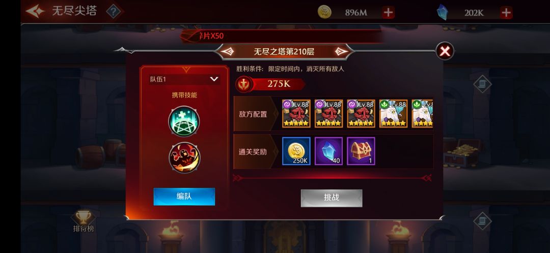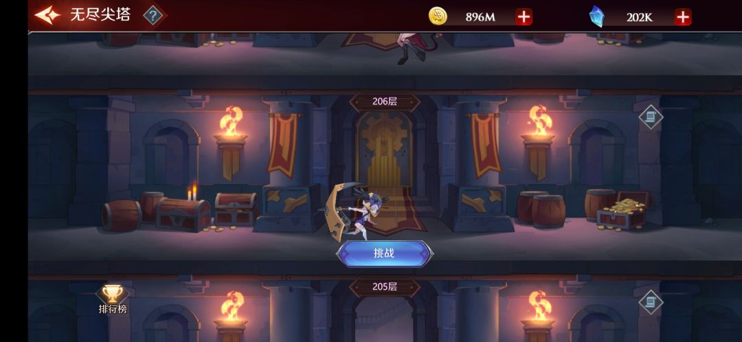 进入后,就是传统的爬塔模式。每层代表一个战斗关,战斗失败可一直攻略,战斗胜利获得奖励并开启下一层。一般每10层会有特殊奖励(主要是符文箱)。