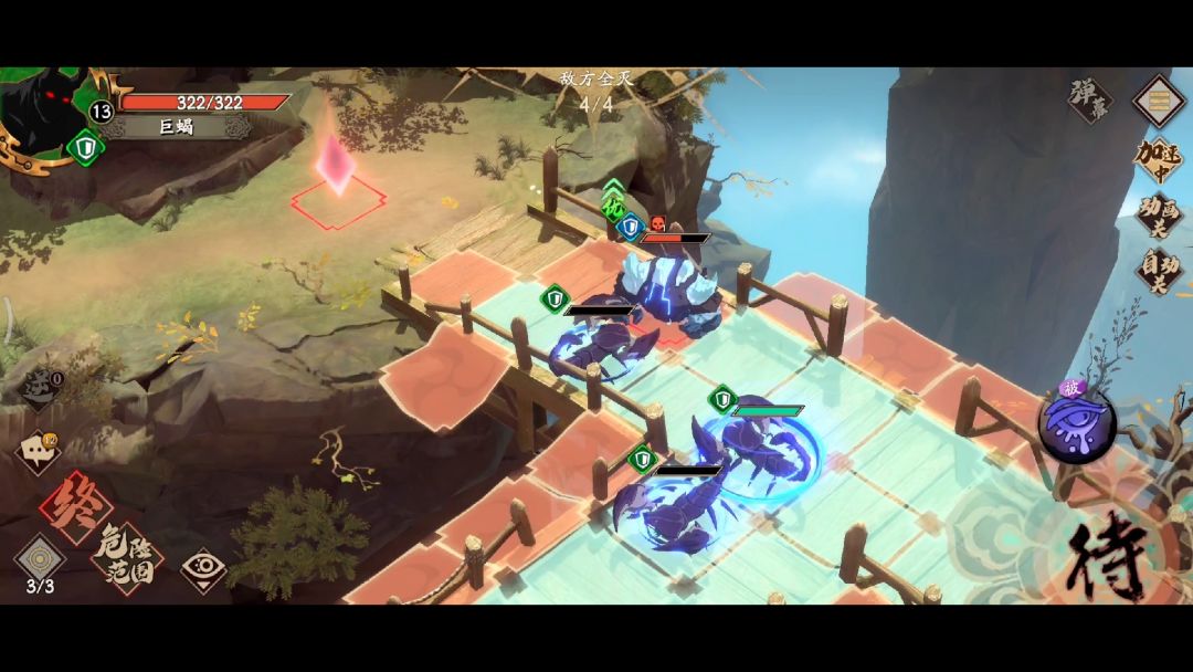 第三回合站位如下,行动结束前的忘截了,就是让上回合刚被打到半血的蝎子去收残血石兵,其他两只蝎子向血多的那只石兵移动