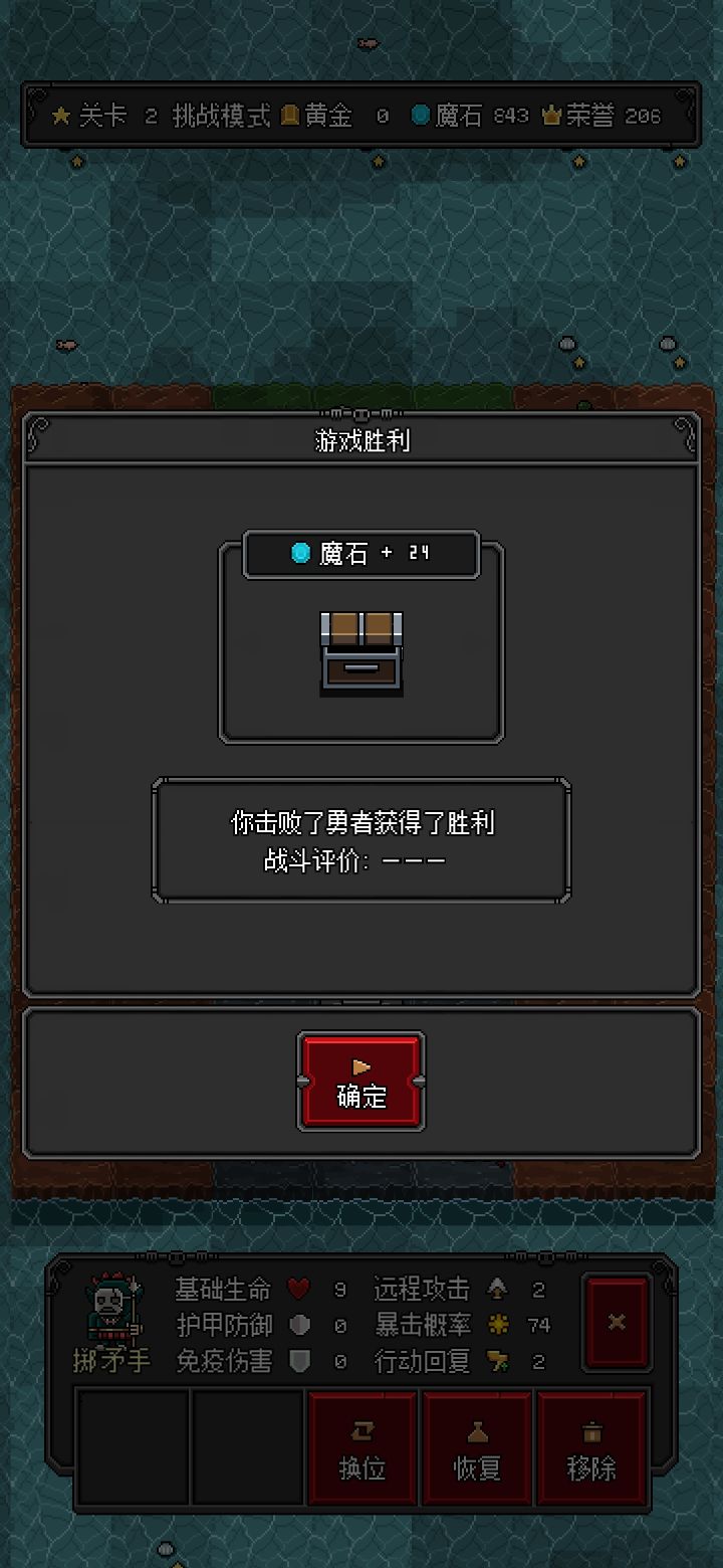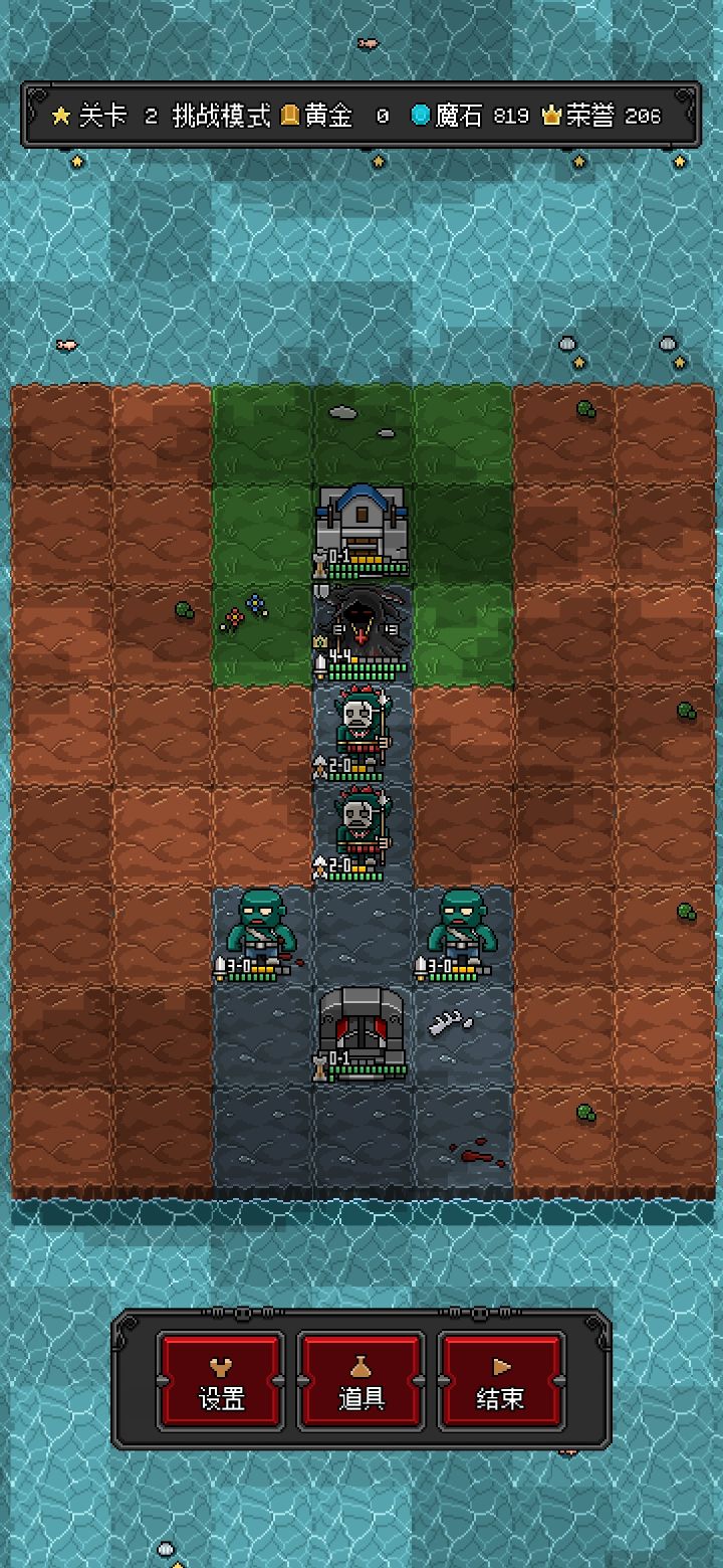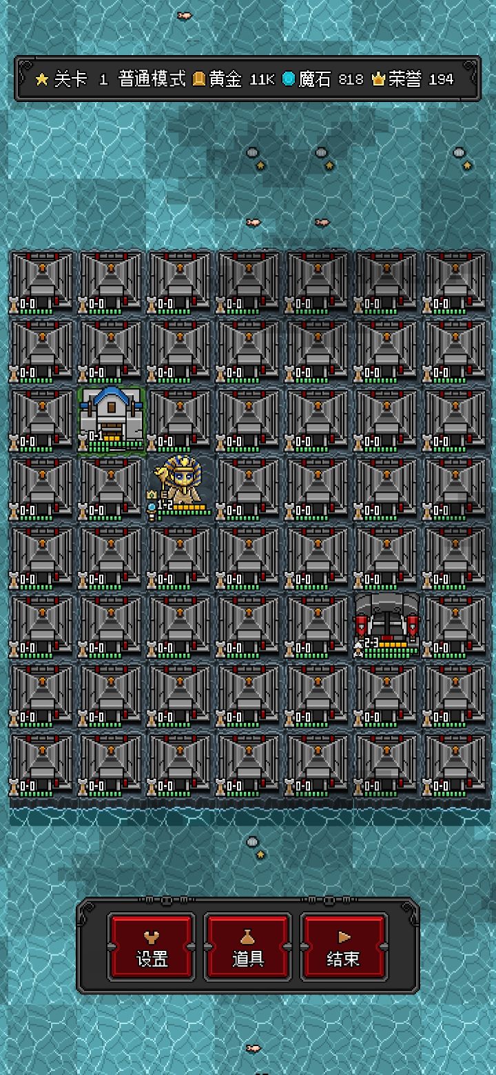 因为之前没用过道具,这次我索性就全用道具,先直接结束让他们把该放的怪全放出来,自己回合用水晶给敌军减3血减到清图,然后远程哥布林把最近的塔给拔了,差不多给老家升级又获得一点行动力就召唤史莱姆轮流换位去占塔筑厂,用史莱姆把前路舔一遍,然后用地穴的蝙蝠轮流喷,地穴行动力没了就拆了在建,喷完了就像史莱姆一样换位占塔,最后两回合全道具过关,大概会花200魔石,反正第二关我9回合就能刷回来,然后游戏就变味了。。。