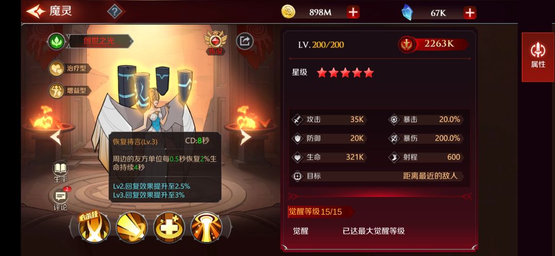 三技能恢复祷言,请不要小看这个技能,这就是创世奶量超高的重要原因之一。该技能没有指定对象数量,相当于类光环技能,对周围所有友方单位生效,而且范围广度相当不错。战斗放置时,建议放在前排到后排中间的位置。这样可以完美覆盖全体队友。
