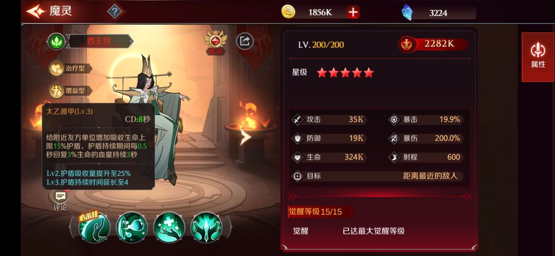 核心技能是必杀技,加盾回血,一次可给三个魔灵加护盾,不过附近魔灵太多就有随机性,尽量把她放得靠近前排,这样,容易给前排加盾。三技能回血中规中矩,四技能保命技能,不过一般都是前排没了才能触发,实际效用不大。(战斗详情里,西王母数据并不好看,主要她给别的魔灵加的盾承受伤害不算她的。)