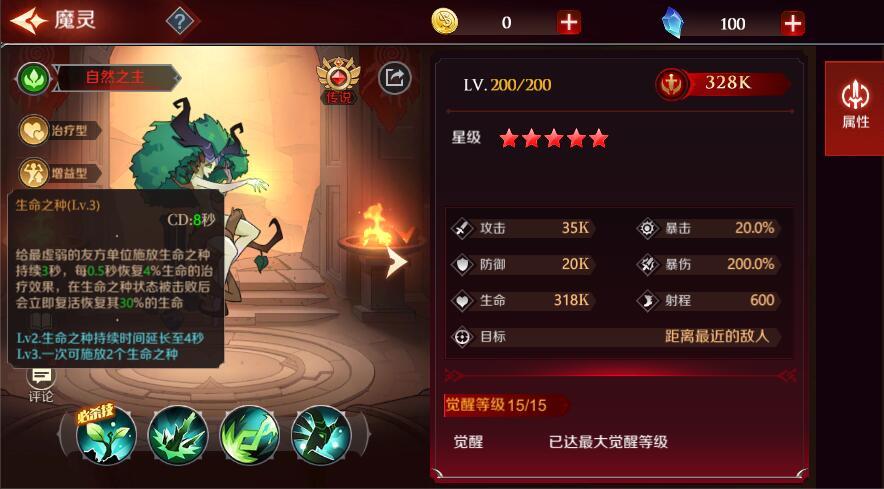 核心技能也是必杀技,生命百分比回血算是标配了,神奇之处是魔灵在生命之种状态下死亡能够复活。满级技能是8秒冷却,存在4秒,还一次释放两个,而最最关键的是被复活对象无冷却。这是什么概念呢?就是如果你的前排够肉,30%的生命在3奶的治疗下能够撑过4秒,那就等于死不了了。(但要小心啊,不要撑到9s啊,那样就白死了)