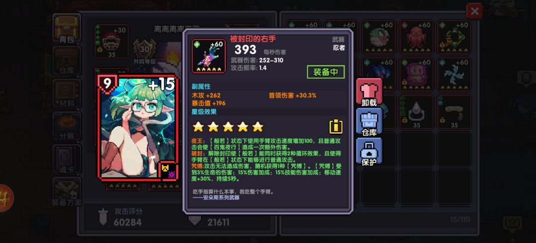 这里鞋子没有选择极影而用了步伐 也是因为鬼忍技伤实在太低 戒指同理 迅捷纹章的加成在泪石面前 简直没法看项链方面有待商榷 应该是马戏团项链更优 至于为啥不用 没洗出来╭(╯ε╰)╮
