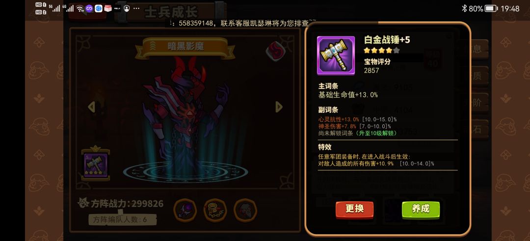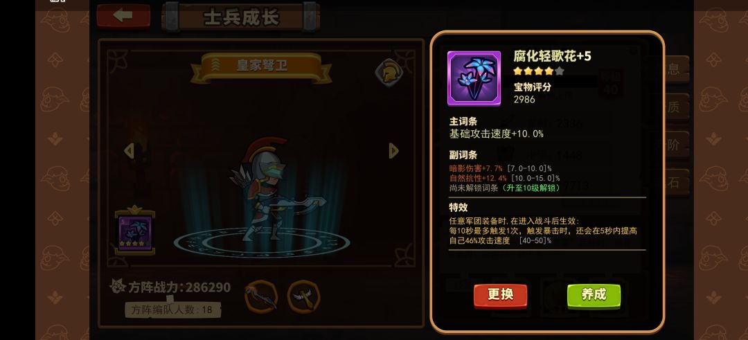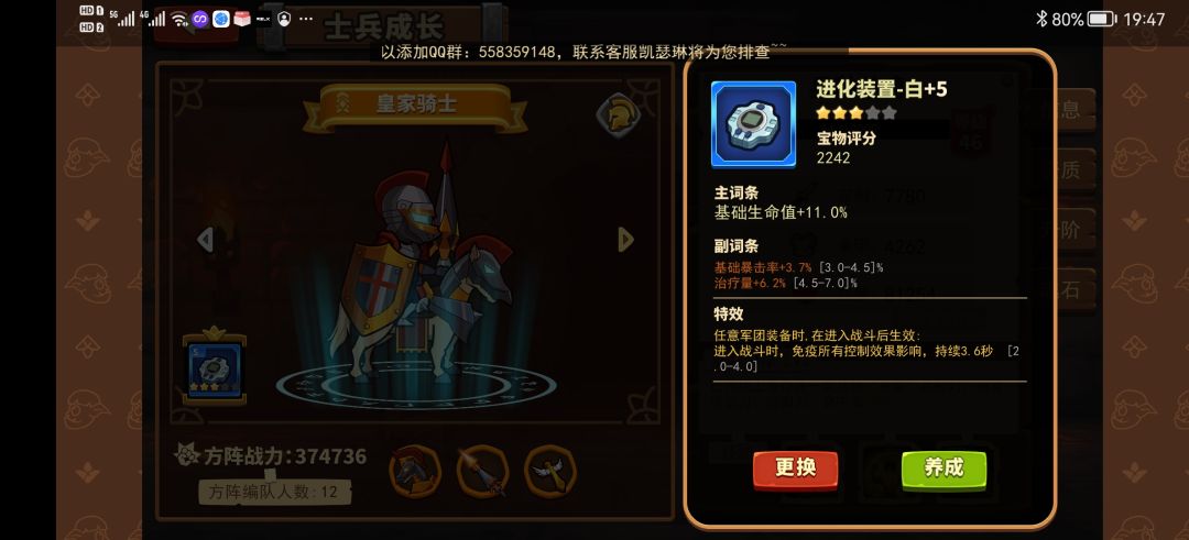 其中最关键的是皇骑的装置白,这个装备对皇骑是很关键的,他能当半个蛛魔用了!在我的布阵中,他大多数时候是用来撞对面的皇骑+杀伤后排的。这个宝物绝对是T0级别的,它提升的不是某个属性或者输出,这是一个战略级别的装备,除了面对狼骑依旧无效。