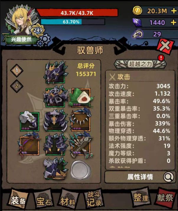 2.野兽流——防御类套装配合属性成长类装备,人苟活,小弟野兽输出。