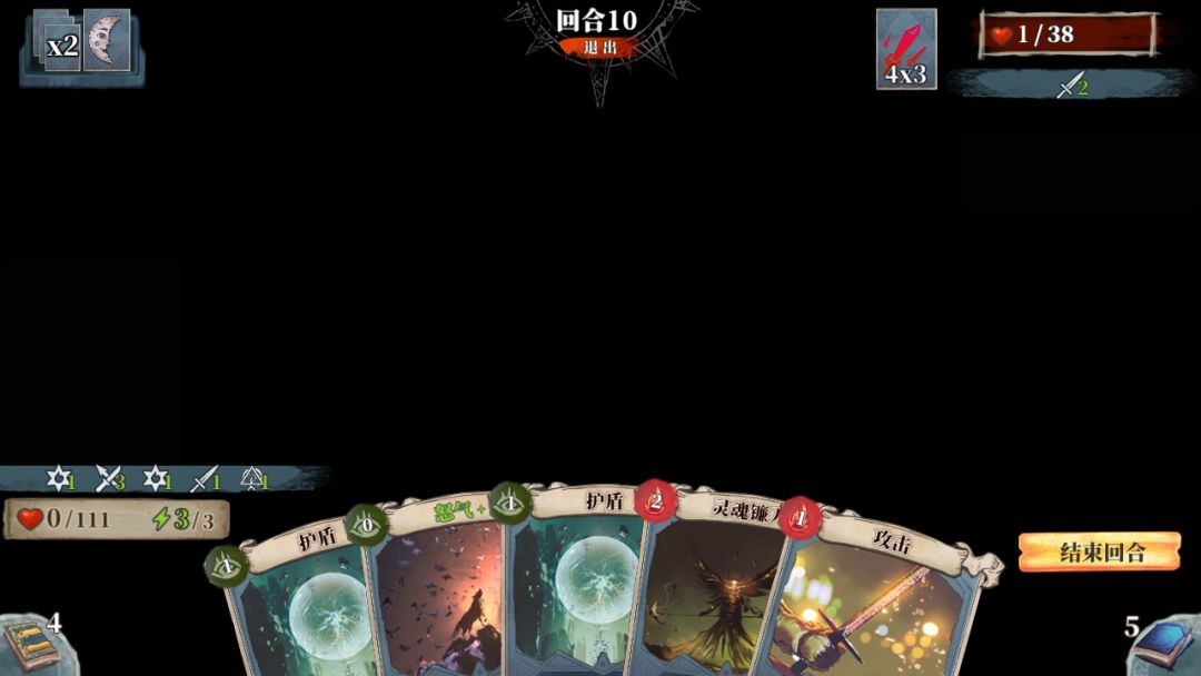 人物死亡后黑屏,可以点结束回合,但不能打牌,敌人不会攻击。