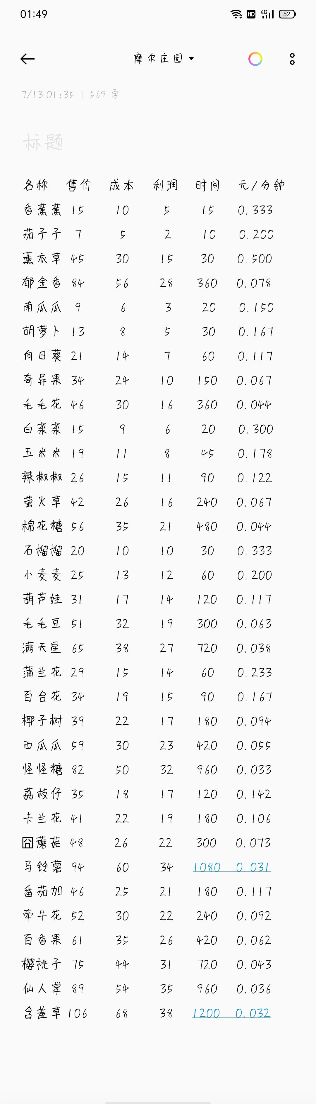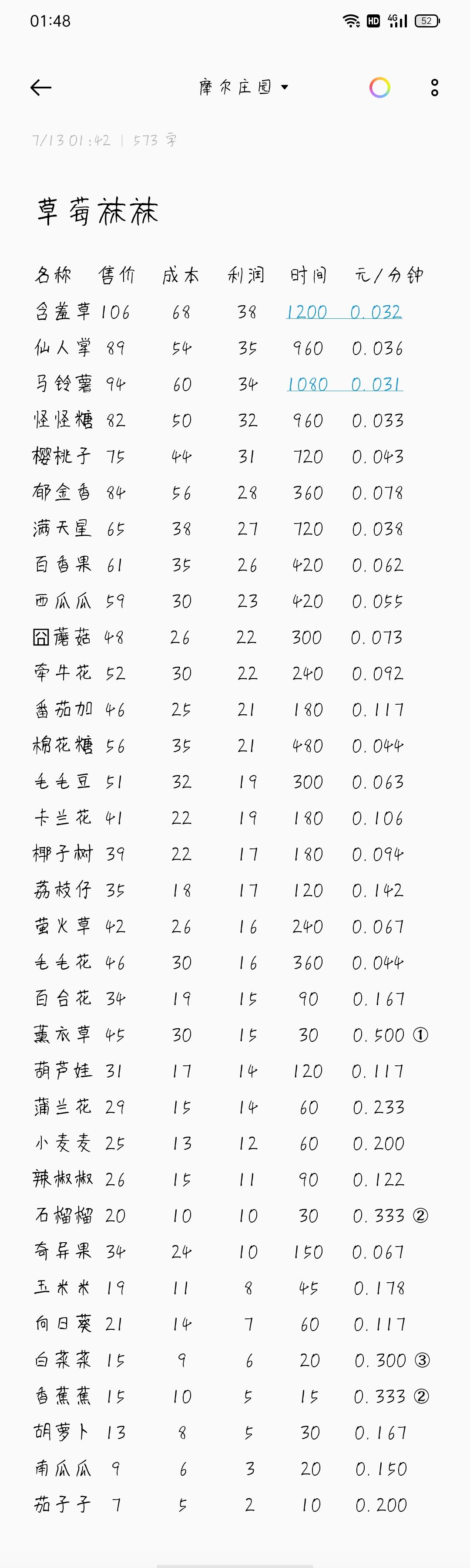 其实看“元/分钟”没用,因为你不可能掐点去种菜收菜,而且它还有限制购买和氪金植株,所以如果不在意时间长短,看“利润”是最好的。