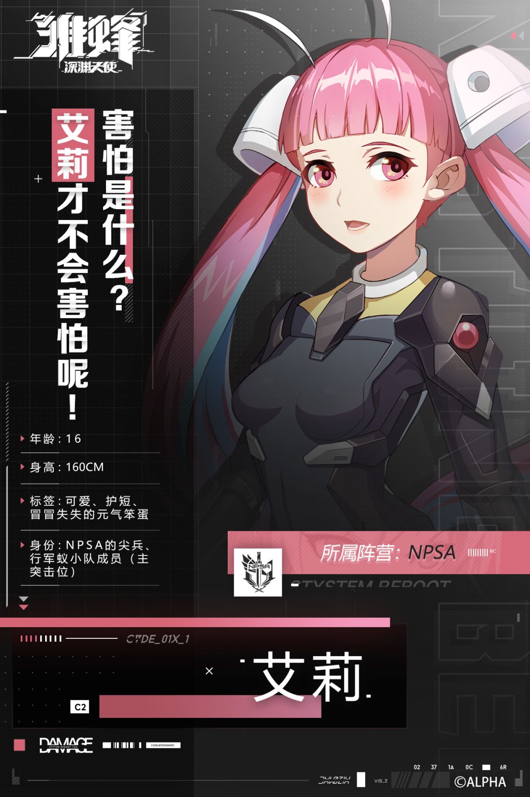 身份:NPSA的尖兵、行军蚁小队成员(主突击位)