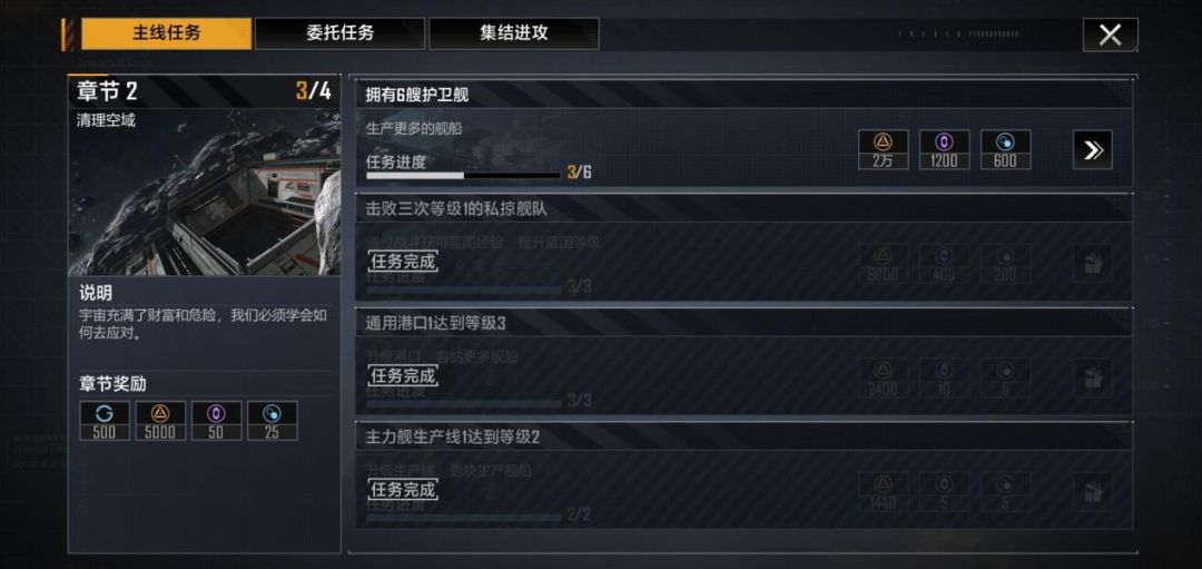 根据不同的类型,这些任务分为了“主线任务”、“委托任务”和“集结进攻”任务。