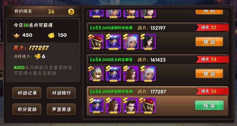 战斗开启后,从敌方随机抽取3位进行挑战,由系统根据战力将敌方分为高、中、低战三档,击败对方获得基础积分,而战斗失败则获得一半的积分。