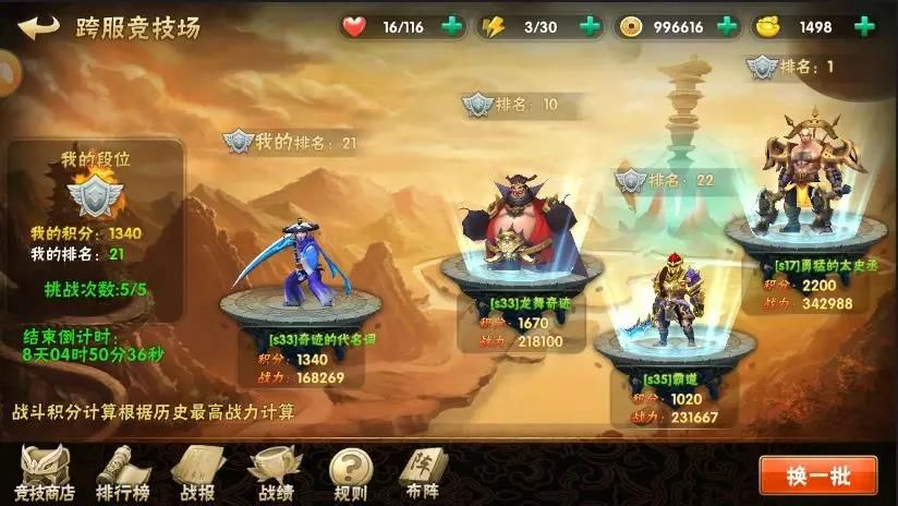 在竞技场中,主公们可以不断挑战其他高排名玩家~成功则互换排名,排名越高则在每日21点结算时可领取的奖励越多!