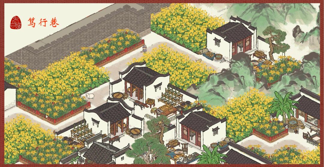 漁梁水坝这主要放的是徽州特色的生产制作类建筑,配以大块的油菜花田显示这个城市的特色。纸墨笔砚四类制作建筑都有保留2个,满足基本的生产要求~