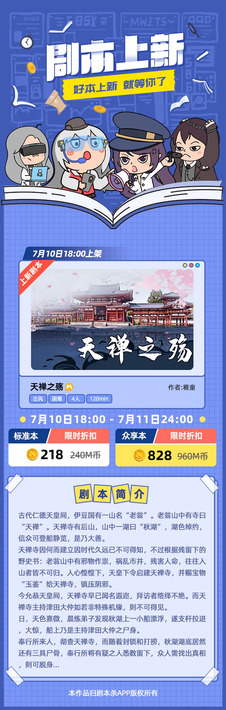 微博关注“剧本杀App官微”并转发抽奖微博,官妹将抽取4位幸运侦探获🉐️官方送出的《天禅之殇》标准本~ 7月13日13:30准时开奖。