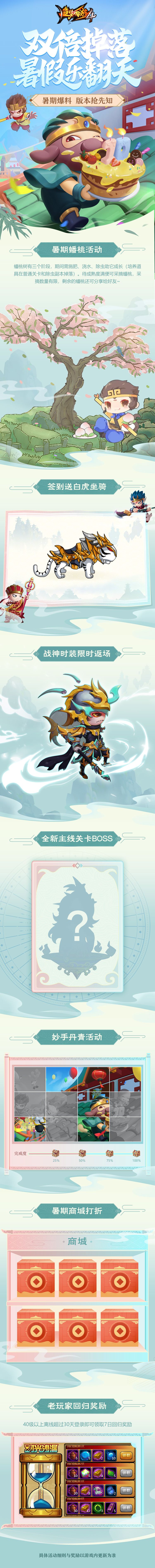 以上就是本月的全部爆料内容了,不仅有经典蟠桃(肝帝)活动、签到即可得白虎坐骑、战神直购返场、商城打折,本月(大概率)还会有一次主线关卡更新哦,具体活动细则与奖励以游戏内更新为准哦~