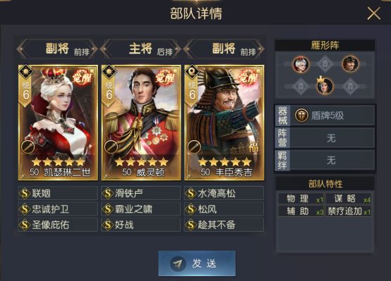 第二种要求较低,放弃了群体先攻,使用的联姻免疫效果来保证威灵顿在虚弱期的伤害,联姻的分担效果和增伤效果,也足够弥补放弃先攻损失的优势,要注意的是丰臣秀吉需尽可能抢到1速,配置松风、岩流斩均能提供先攻状态,前者高速后者补伤害,根据个人配置进行选择即可。