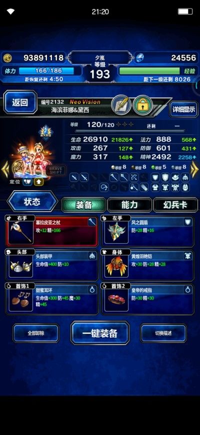 推荐配装:星辰魔棒+DV魔棒,帽子衣服高魔,首饰超信+鸦妹超信(或者双鸦妹超),插件装备魔棒/克罗瓦信赖,卢内拉超信秘迹/紫晓超信/团购光之守护者凯莉/破魔植物+魔灭之威压,风女巴尔巴利西亚普信/CG蒂娜超信插件,幻兽带巴哈点出M斩魔M亡兽,或者带伊芙利特亡兽改,蒂娜LB满级,法伊LB30+最好