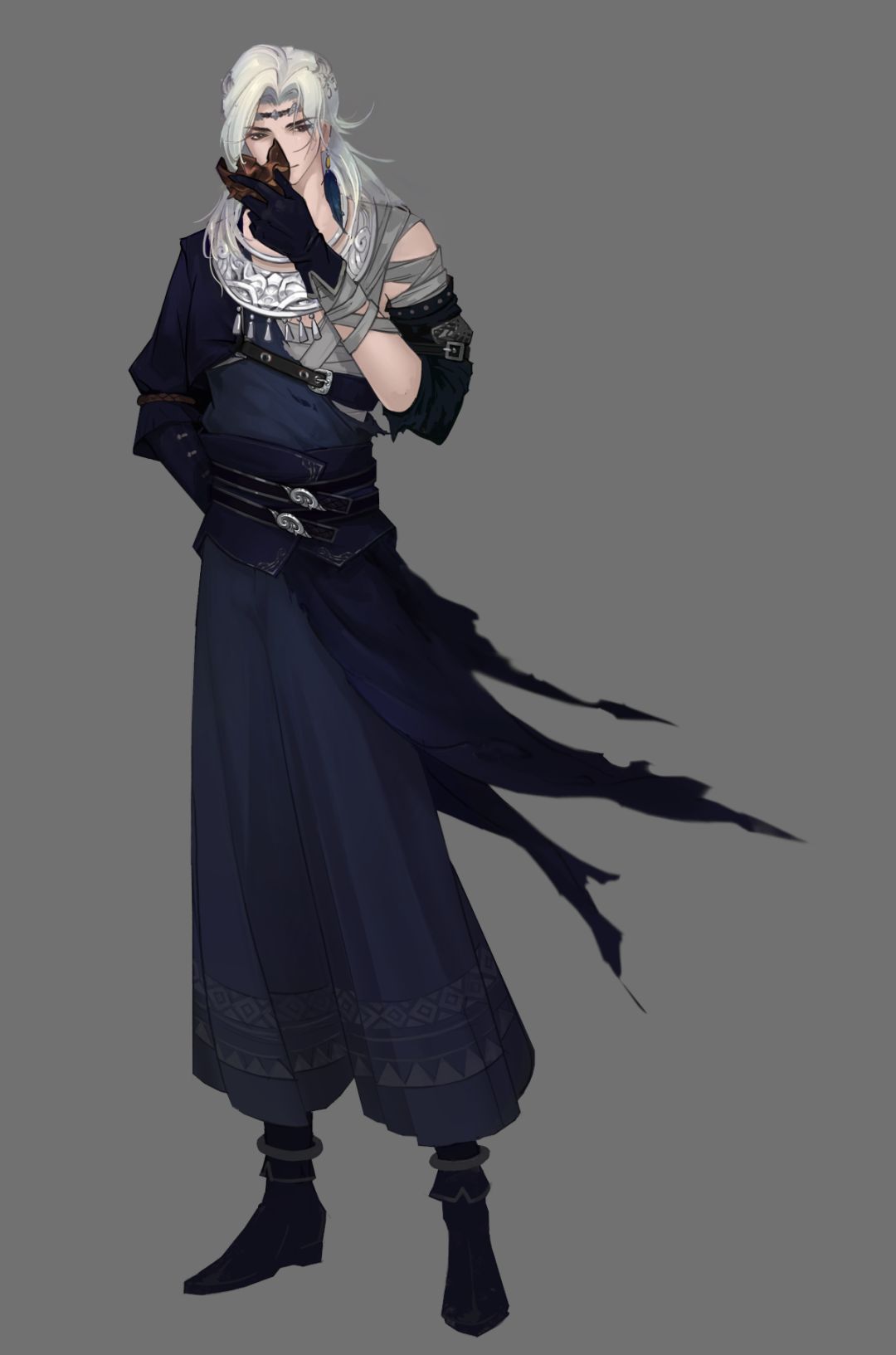 愿祈南疆祀,朝来贺清平。南疆祀时装恰如其名,是因尤川万毒窟少祀官的身份及其个性特色有感,从而衍生出的一套时装。这套时装以民族服饰风格为基础,主体蓝色结合苗族男装常用颜色的同时又有所变化,因不同部位而深浅有别,既使得时装风格沉稳内敛,又让整体设计层次清晰、不会显得单调。