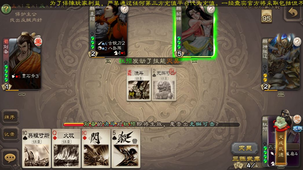 3⃣️【灭吴】回合内输出(aoe,顺拆)+控制(兵乐)回合外辅助(无邪、桃)在这点上虽然比不上张让的爆发,但胜在可以在濒死拿桃捞人。最重要的是不限次数!!!也可以理解只要回合外有牌,就相当于稳定的桃/无邪。所以为了保障技能发动,装备栏一定得弄满当,一是补充标记,二是为了存牌(五血身板也怕拆啊)
