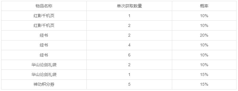 2、可抽取:红影千机页、经书、华山论剑礼袋等超值大奖,100%中奖率!