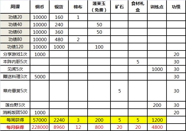 日课、周课以及活动期间开启的活动每日修行:什么铜币不够呀,饭团不够呀,棉布呀,蓬莱玉呀,银货,每日累计下来一个月可不少…