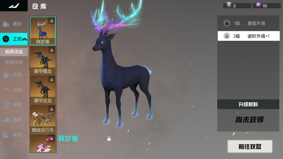 •仓库-工坊-载具改造界面新增灵犀兽升级,消耗灵犀核心和时装碎片即可升级灵犀兽,最高可以升级为释梦兽。