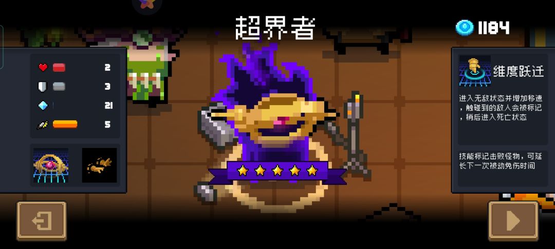 介绍一下新英雄,超废者!高达22000的解锁前置且不是常驻英雄,面板就是在告诉你两万多蓝币买了个寂寞,被动技能每隔一段时间会隐身,该过程不会吸引金币能量球百分之50概率无视伤害,开启技能后增加移速正面180°无视子弹,进入毒区火区正常受到伤害,无视地形点燃剧毒迟缓效果,激光陨石以及背后正常受到伤害,开启技能后碰撞敌人造成5点伤害附加一个貌似是增加暴击率的标记,印记在倒计时8秒后造成80点固定伤害,每多碰撞一次重置标记时间增加5点固伤,ps:别去撞猪,初始武器攻击速度中等飞行速度慢,3点伤害暴击6点,子弹方面参考拳皇大蛇的黑粒子,有击墙特性,整个人物打吊炸天实战效果比我刷次元斩的时候还难点,无特殊情况几乎无法击败任何一个3-5boss,包括阿努比斯那个白给货,太垃圾不做评价,推荐武器:地下水+连点器