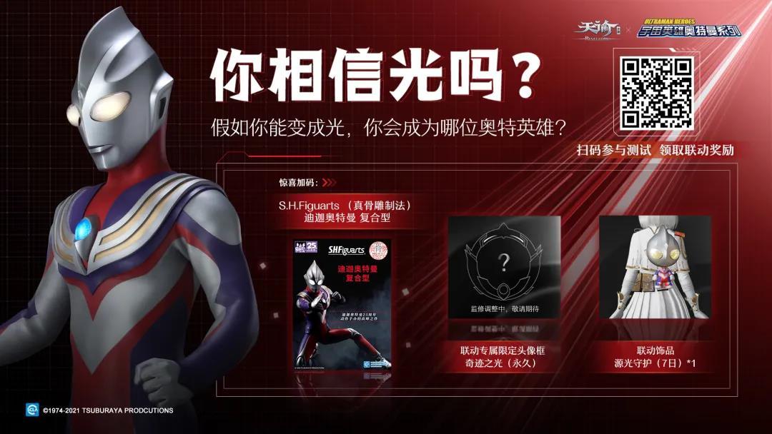 扫码测试并预约资料片,就能领取联动奖励:联动专属限定头像框奇迹之光(永久)、奥特英雄背饰(7天),还有机会获得极其珍贵的S.H.Figuarts(真骨雕制法)迪迦奥特曼!