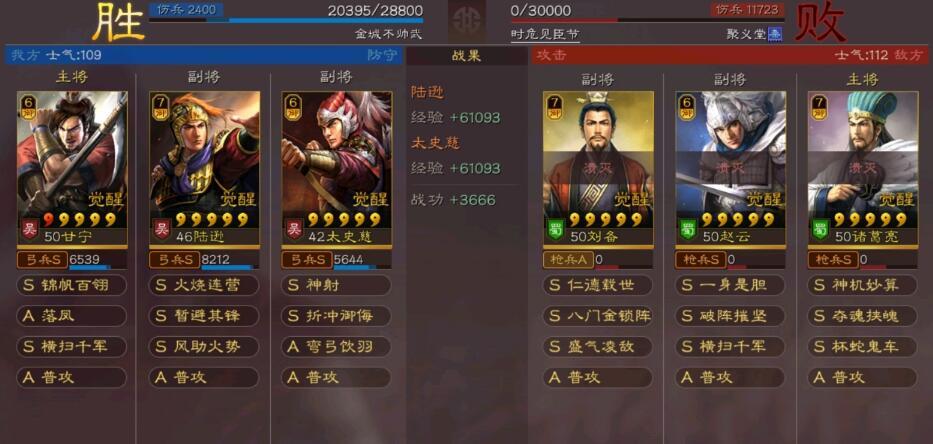 这个阵容和天枪阵容打了两拨,都是大兵力获胜,只能说正常的话64开始还是有的,毕竟是兵种克制优势!如果输的话,那么基本上就是甘宁和陆逊被诸葛亮控的死死的,或者己方战法都不怎么触发的情况下。
