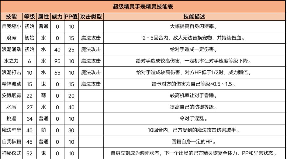 配招:自我缩小+自我恢复+精神波动+水之力/魔法壁垒/安眠烟雾/神秘仪式