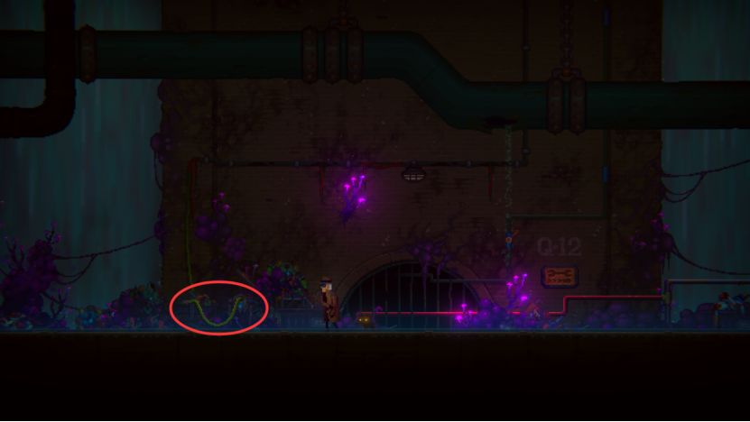 获得蓄电囊后,我们在左边使用电工剪获得【电缆线】,随后返回之前的绿门。