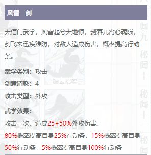 “风雷一剑”可以提升自身的行动条,让天信门弟子能够更加快速的出手,甚至能做到连续不断的攻击,让对手毫无还手之力。