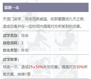 “雷霆一击”为天信门弟子最常使用的武功,此招攻击迅疾威猛,还能够在1息内提升对手30%所受到的伤害。