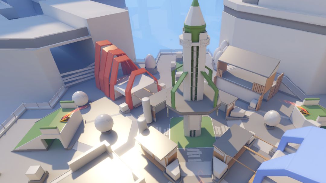在设计过程中,我们对初始出生点的位置也进行了多次调整。考虑到大家会有利用跳板的意愿,所以我们鼓励玩家在游戏开始后,能较快到达跳板位置。但因为跳板数量多,中央高台的面积又比较小,不可能让多名玩家同时落到高台上。因此在出生点位置分布以及朝向上,我们会考虑让不同的玩家分批次跳上高台。