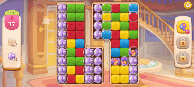 ii. 在两个道具相邻时点击,盘内此时与【彩虹硬糖】同颜色的基础元素全部变成【双向导弹】,然后随机进行整行整列消除。