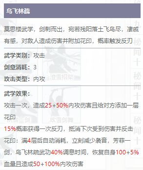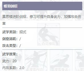 莫思楼的蝶羽剑招乃是内攻剑招,修习以后可提升自身武力。会按照剑招提升武力值的2倍增加自身的内攻攻击力。