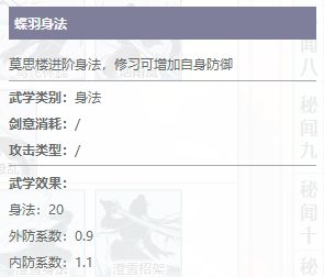 蝶羽身法修习以后可以提升自身的身法值,提升的身法值会按照1.1倍的比例提升内攻防御,按照0.9倍的比例提升外攻防御。