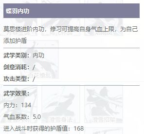 蝶羽内功修习以后可以提升自身的内力值,会根据其提升内力值的5倍增加自身的气血,且战斗开始时获得一定量的护盾。