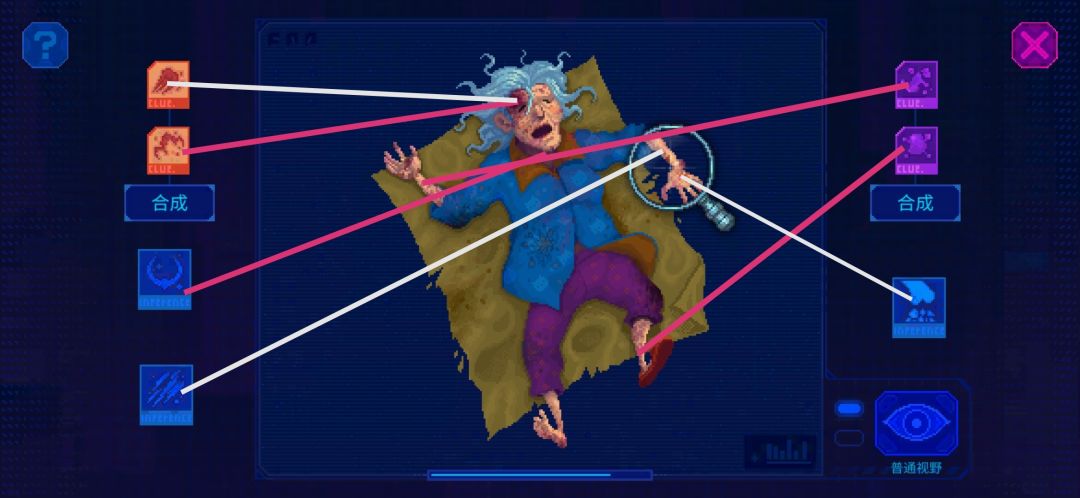 很多人以为能扫描的地方就是能收集证据,额其实并不是,部分可以扫描但不显示文字的就是不用收集,后面所有扫描的关卡都一样,一个地方可以切换视野扫两次,多找找,放大镜下不去的那就是那里没证据不要纠结了。。